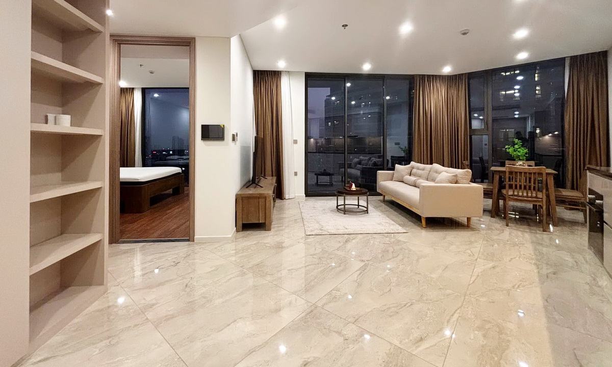 Mỗi căn hộ đều sử dụng vật liệu cao cấp: sàn gỗ tự nhiên, cửa kính Low-E chống tia UV, thiết bị bếp châu Âu, hệ thống điều hòa âm trần và cửa chống ồn… giúp tối ưu hóa trải nghiệm sống hiện đại, sang trọng.